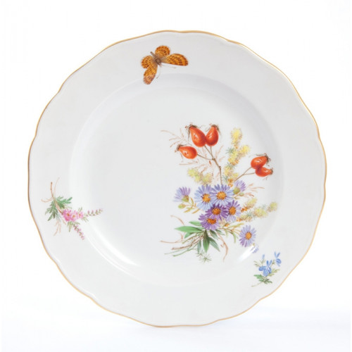 Speiseteller, Form "Neuer Ausschnitt", Blume naturalistisch, bunt, mit Schmetterling, Goldrand, L 25 cm