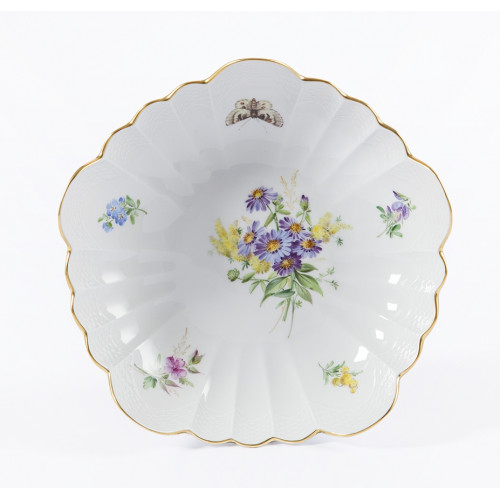 Beilageschale flügelförmig, Blume naturalistisch, bunt, mit Schmetterling, Goldrand, 20 cm