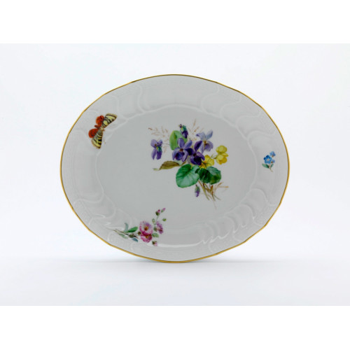 Beilageschale oval, Blume naturalistisch, bunt, mit Schmetterling, Goldrand, 23,5x20 cm