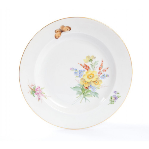 Teller, Form "Glatte Form", Blume naturalistisch, bunt, mit Schmetterling, Goldrand, ø 20 cm