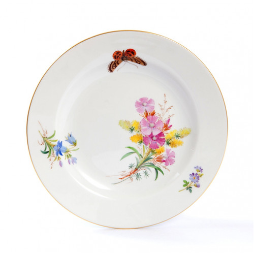 Teller, Form "Glatte Form", Blume naturalistisch, bunt, mit Schmetterling, Goldrand, ø 19 cm