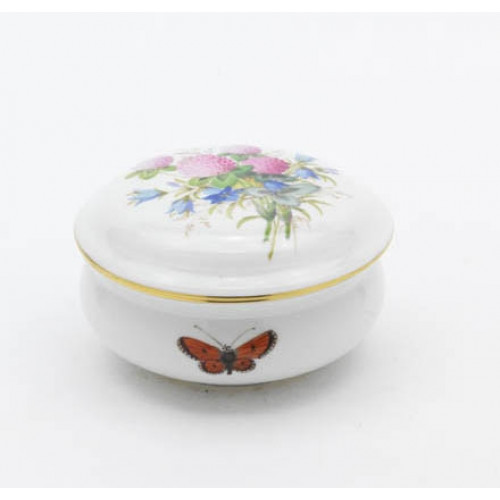 Dose, Form "Neuer Ausschnitt", Blume naturalistisch, bunt, mit Schmetterling, Goldrand, ø 9 cm