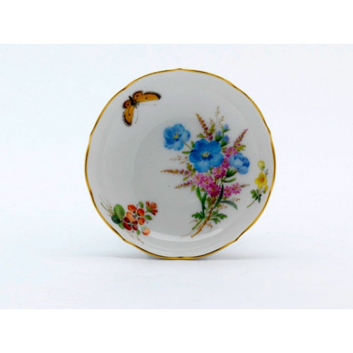 Schälchen, Form "Neuer Ausschnitt", Blume naturalistisch, bunt, mit Schmetterling, Goldrand, ø 8 cm