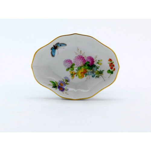 Schälchen, Form "Neuer Ausschnitt", Blume naturalistisch, bunt, mit Schmetterling, Goldrand, L 8 cm