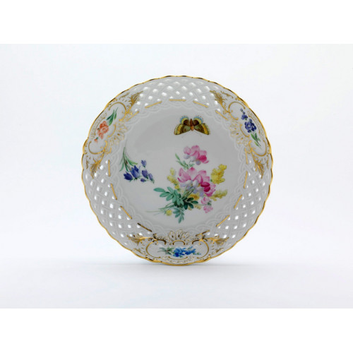 Schale, durchbr. rund, Blume naturalistisch, m.Schmetterling, Schilderorn.goldstaff., Goldr., ø 21 cm
