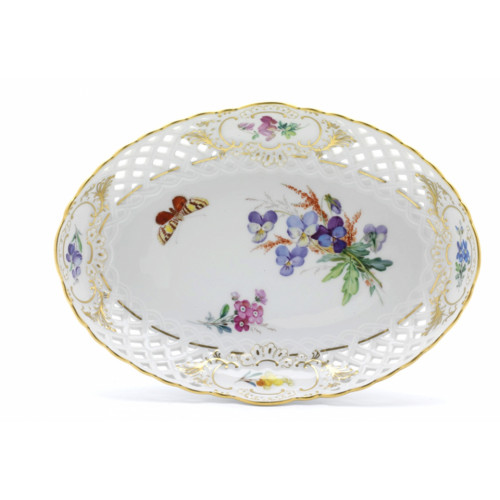 Schale, durchbr. oval, Blume naturalistisch, m.Schmetterling, Schilderorn.goldstaff., Goldr., L 22 cm