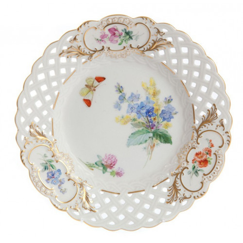 Teller, durchbr., Blume naturalistisch, m.Schmetterling, Sondersignet, Golddekoration, ø 19 cm