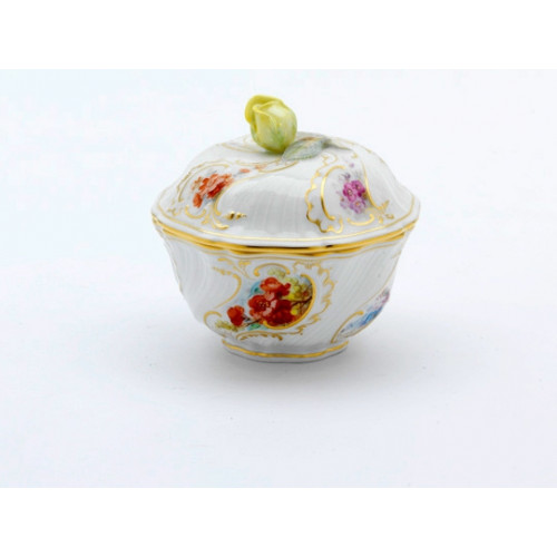 Dose, Blume naturalist.,seitlich,bunt,Hintergrund angedeutet,Golddekoration, 9 cm