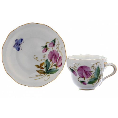 Espressotasse m.U., Form "Neuer Ausschnitt", Wicken naturalistisch, bunt, mit Schmetterling, blau, Goldrand, V 0,1 l