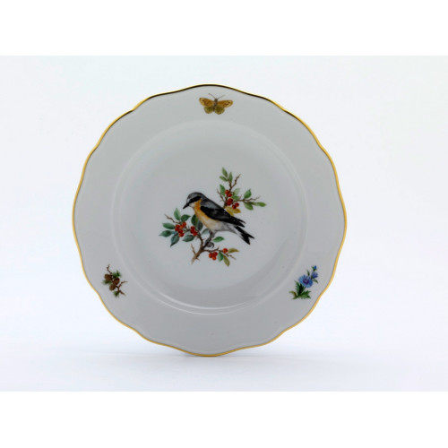 Teller, Form "Neuer Ausschnitt", Vogel- und Insektenmalerei, leicht, bunt, Goldrand, ø 16 cm