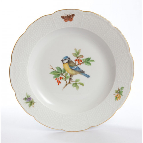 Teller,flach, Vogel- und Insektenmalerei, leicht, bunt, Goldrand, 18 cm