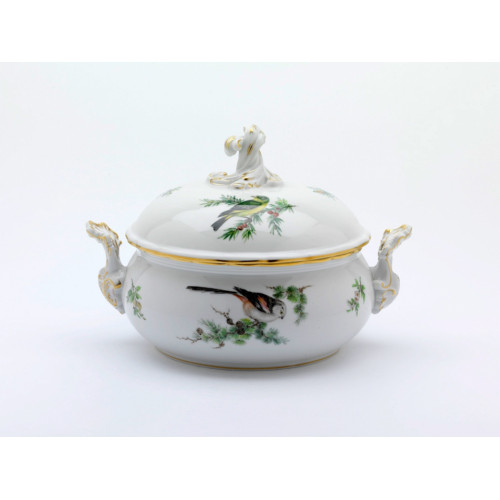 Terrine, rund mit Schnörkel, Form "Neuer Ausschnitt", Vogelmalerei seitlich, leicht, bunt, Goldrand, V 2,25 l