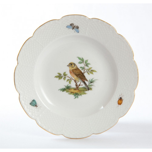 Teller,flach, Vogelmalerei auf Stamm und Terrasse, alte Manier, 1 Vogel, Goldrand, 16 cm