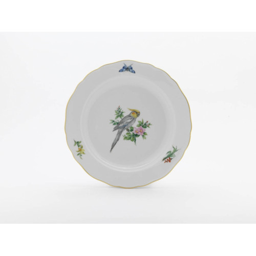 Teller, Form "Neuer Ausschnitt", Vogel- und Insektenmalerei, exotisch, bunt, Goldrand, ø 22 cm