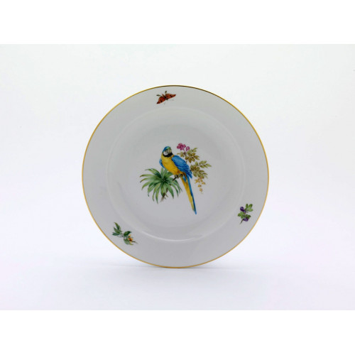 Speiseteller, Form "Glatte Form", Vogel- und Insektenmalerei, exotisch, bunt, Goldrand, 25 cm