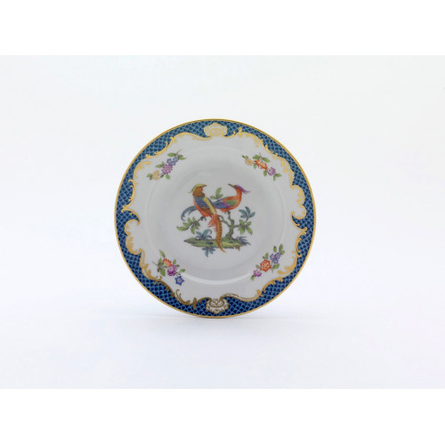 Teller,flach, Form "Glatte Form", Exotische Fasanenvögel,2 Vögel m.Bl.,kobaltbl.Schuppenmosaik,Golddek., 16 cm