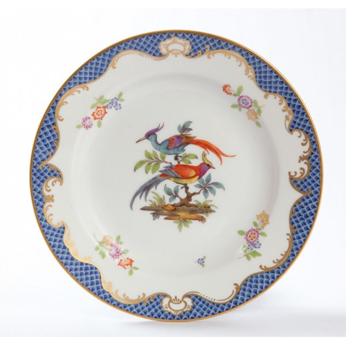 Teller, Exotische Fasanenvögel,2 Vögel m.Bl.,kobaltbl.Schuppenmosaik,Golddek., ø 19 cm