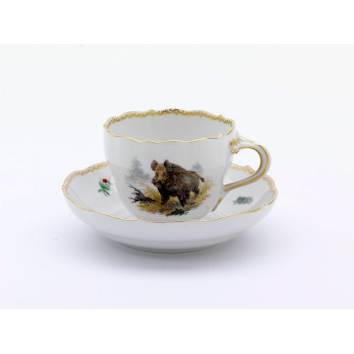 Tasse m.U., Form "Neuer Ausschnitt", Wildmalerei nach Ridinger, bunt, Goldkante, Goldrand, V 0,15 l
