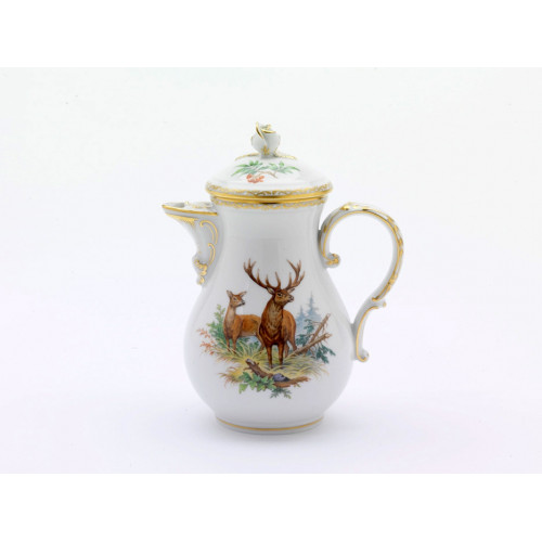 Mokkakanne, Form "Neuer Ausschnitt", Wildmalerei nach Ridinger, bunt, Goldkante, Goldrand, V 0,45 l
