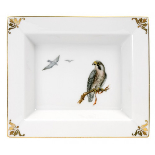 Vide-poche mittel, Naturalistische Tiermalerei, Motiv: Falke, Goldornamente, Goldrand, 16 x 13,5 cm