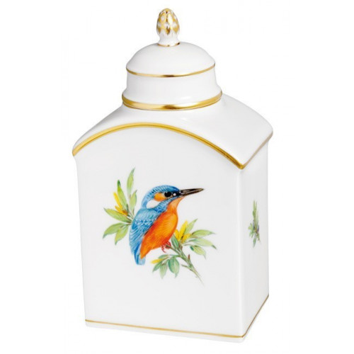 Teedose, Form "Neuer Ausschnitt", Vintage Vogelmalerei, Motiv - Eisvogel, Goldrand, H 14 cm