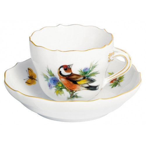 Espressotasse, Form "Neuer Ausschnitt", Vintage Vogelmalerei, Motiv - Stieglitz, Goldrand, V 0,1 l