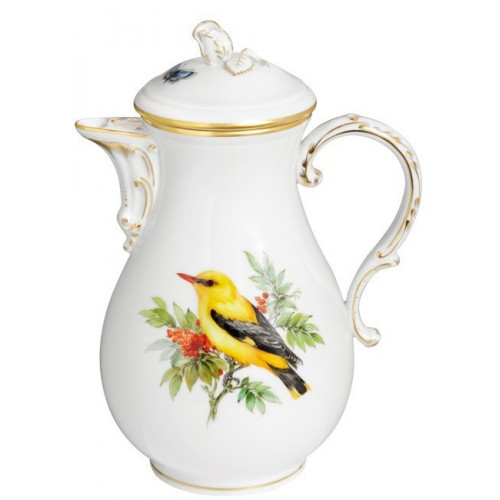 Kaffeekanne, Form "Neuer Ausschnitt", Vintage Vogelmalerei, Motiv - Pirol, Goldrand, V 1,20 l