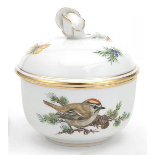 Zuckerdose, Form "Neuer Ausschnitt", Vintage Vogelmalerei, Motiv - Goldhähnchen, Goldrand, Ø 9 cm