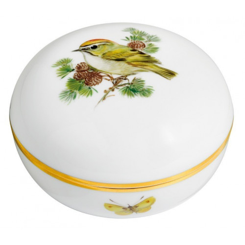 Dose, Form "Neuer Ausschnitt", Vintage Vogelmalerei, Motiv - Goldhähnchen, Goldrand, ø 7,5 cm