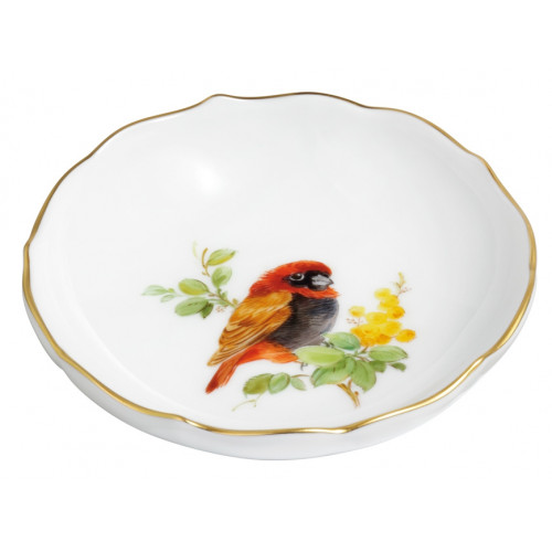 Schälchen, Form "Neuer Ausschnitt", Vintage Exotische Vogelmalerei, Motiv - Feuerweber, Goldrand, ø 8 cm