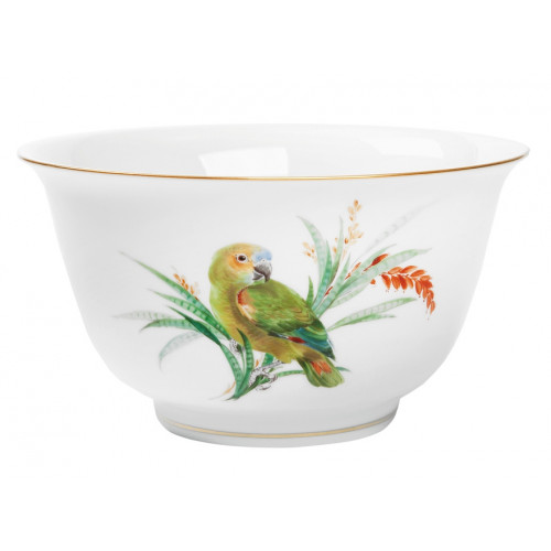 Müslischale, Form "Neuer Ausschnitt", Vintage Exotische Vogelmalerei, Motiv - Rotbugamazone, Goldrand, L 16 cm