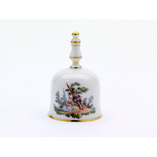 Tischglocke, Figurenmalerei nach Watteau mit Blume,bunt mit Kupferfarben,Goldrand, H 11 cm