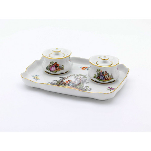 Schreibzeug, Figurenmalerei nach Watteau mit Blume,bunt mit Kupferfarben,Goldrand, 23x16 cm