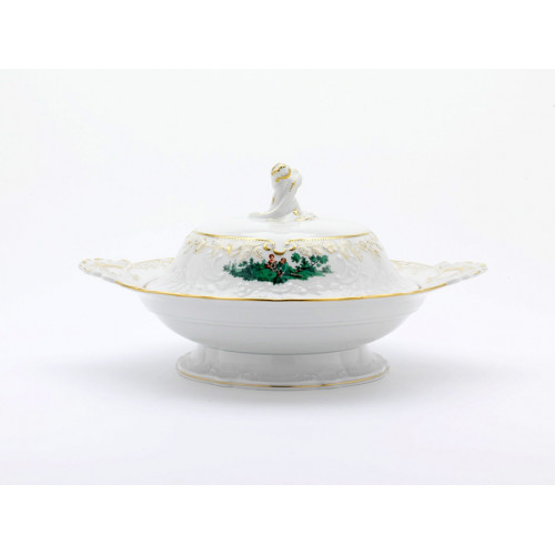 Schüssel m.Deck., Form "Neumarseille", Figurenmalerei n.Watteau m.Blumen, kupfergrün, Golddekoration,Goldrand, 0,8 l