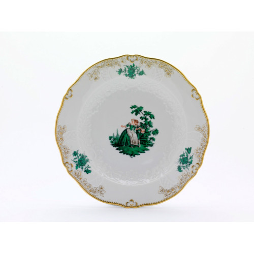 Speiseteller, Form "Neumarseille", Figurenmalerei n.Watteau m.Blumen, kupfergrün, Golddekoration,Goldrand, 25 cm