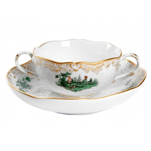 Suppentasse m.U., Form "Neumarseille", Figurenmalerei n.Watteau m.Blumen, kupfergrün, Golddekoration,Goldrand, 0,23 l