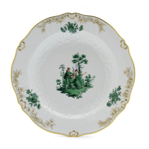 Speiseteller, Form "Neumarseille", Figurenmalerei n.Watteau m.Blumen, kupfergrün, Golddekoration,Goldrand, 25 cm