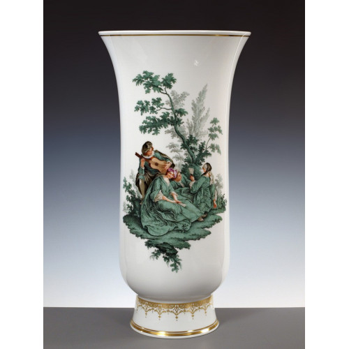 Vase, Figurenmal.nach Watteau m.Blumen, kupfergrün, Goldkante Nr.15,Goldrand, H 41 cm