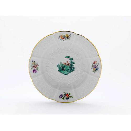 Suppenteller, Figurenmalerei n.Watteau,kupfergrün,Blumenbuk.bunt m.Kupferfarb.Goldr., 22 cm