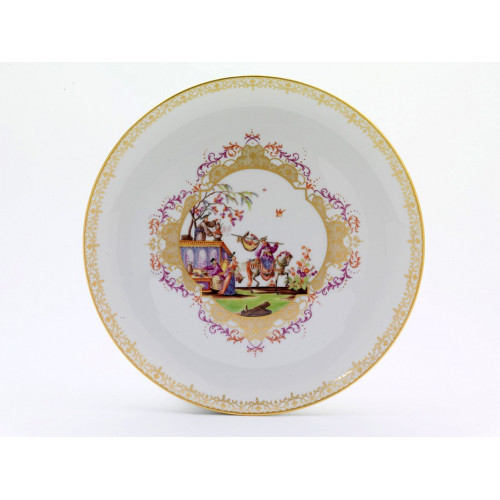 Kuchenschale rund, Chinois.n.Hoeroldt,bunt,ind.Blum.bunt,gelb glas.Schilder,Golddekorat., ø 28 cm
