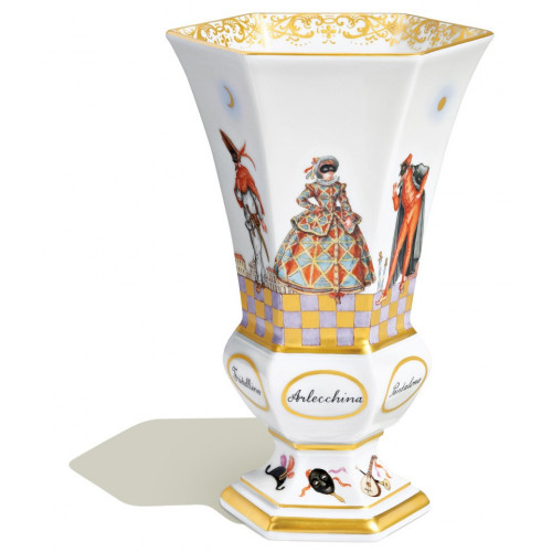 Die Commedia dell’arte war Volkstheater ursprünglichster Art, das ab dem 16. Jahrhundert von Italien aus Europa eroberte. Populär, wie es war, schlug es sich auch in anderen Kunstformen nieder. Die Figuren der Italienischen Komödie aus Meissener Porzellan® sind weltbekannt, und natürlich finden sich die Motive auch in der Porzellanmalerei wieder. Hier erscheinen sechs von ihnen auf einer Vase (Balusterform von 1730) in opulentem, renaissanceartig anmutendem Stil. Das delikate lila-goldene Schachbrettmuster markiert die typische Bühne der Commedia dell’arte, und im Hintergrund erscheint die Kulisse von Venedig.