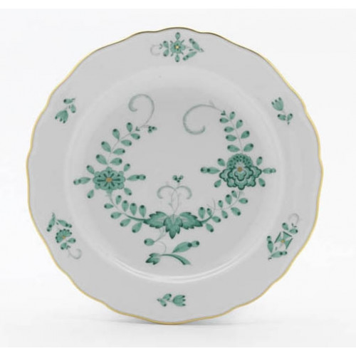 Teller, Form "Neuer Ausschnitt", Indische Malerei 1, ohne Kante, grün, Goldpunkte, Goldrand, ø 18 cm