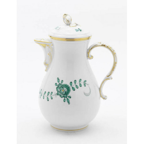 Kaffeekanne, Form "Neuer Ausschnitt", Indische Malerei 1, ohne Kante, grün, Goldpunkte, Goldrand, V 1,20 l