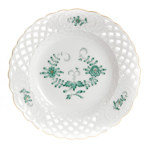 Teller, durchbr., Indische Malerei 1, ohne Kante, grün, Goldpunkte, Goldrand, ø 15 cm