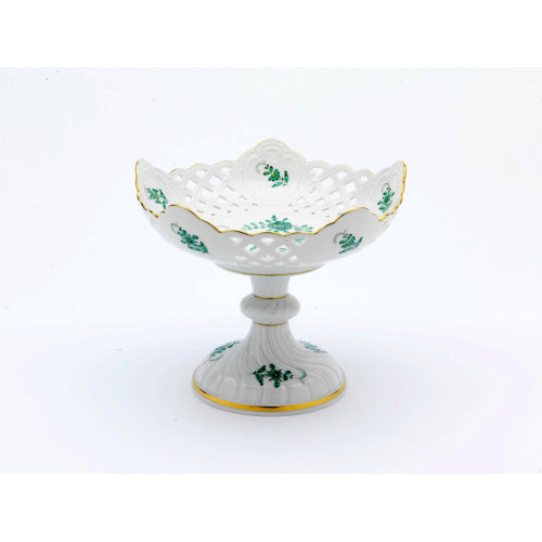 Schale auf Fuß durchbrochen, Indische Malerei 1, ohne Kante, grün, Goldpunkte, Goldrand, H 17 cm