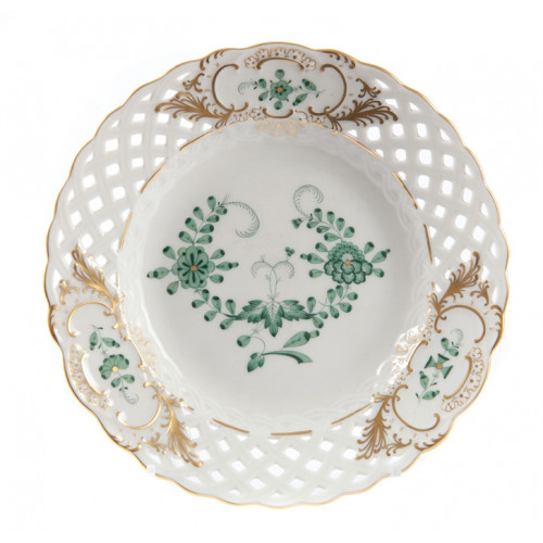 Teller, durchbr., Ind.Malerei 1,o.Kte,grün,Goldpunkte,Schilderorn.goldstaff.,Goldrand, ø 15 cm
