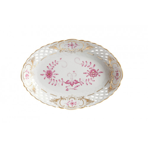 Schale, durchbr. oval, Ind.Malerei 1,o.Kante,purpur,Goldpunkte,Schilderorn.goldstaff.Goldrand, L 22 cm