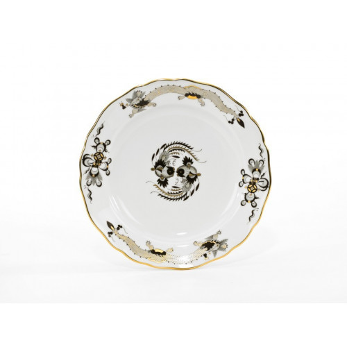 Teller, Form "Neuer Ausschnitt", Reicher Drache, schwarz, goldschattiert, Goldrand, ø 18 cm