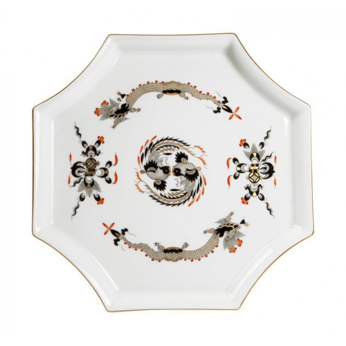 Platte,achteckig, Reicher Drache, schwarz, goldschattiert, Goldrand, L 21 cm