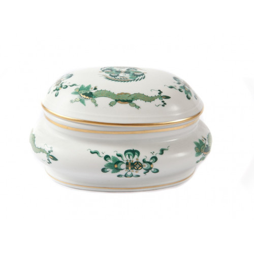 Dose, Reicher Drache, grün, goldschattiert, Goldrand, L 12 cm